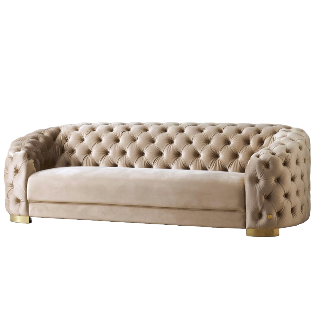 Elevate your living space with this stunning Koala Living sofa, available exclusively at Vanik, your trusted refurbished furniture seller. Featuring a timeless Chesterfield-inspired design, this elegant piece boasts plush, deep button-tufted upholstery in a sophisticated neutral shade, complemented by chic gold-finished feet for a touch of glamour.