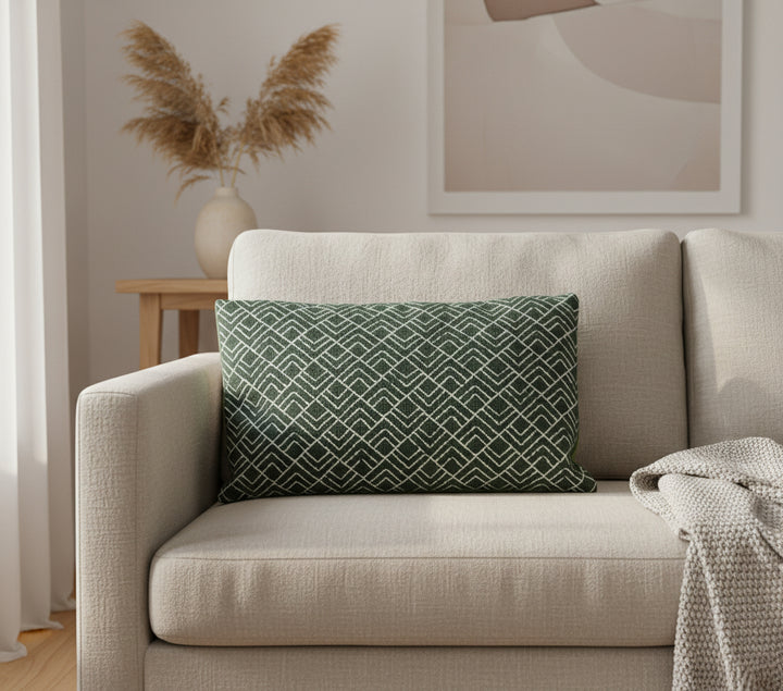 Inspired by the bold geometry of the Art Deco era and the intricate beauty of traditional textile weaving, the Apex Pillow is a statement of timeless design. This exquisite piece features a mesmerising slub jacquard weave, where an intricate pattern of interlocking, ascending chevrons in a crisp off-white climbs across a deep olive green canvas. The subtle, organic texture of the slub yarn adds a layer of depth and character to the sharp, graphic design, creating a perfect balance between precision and artistry.