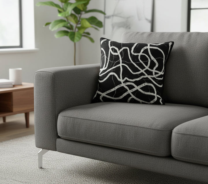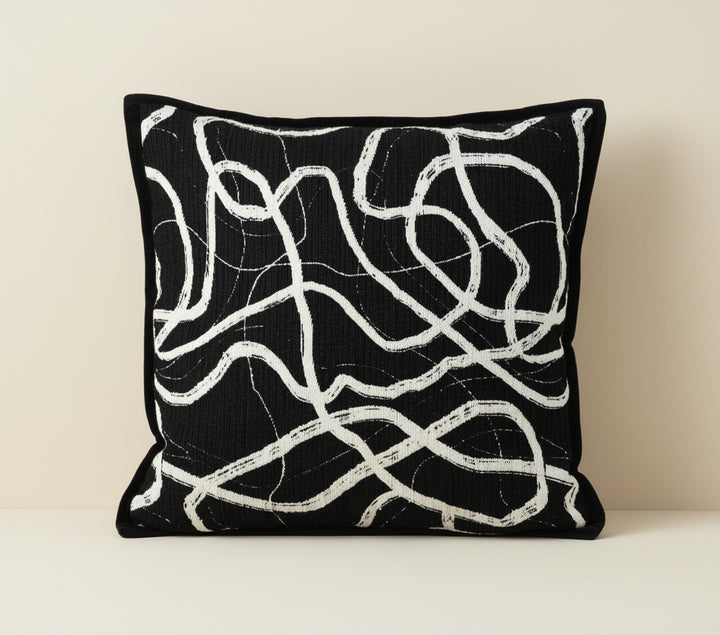 Inspired by the bold energy of abstract expressionism and the freedom of a single, continuous brushstroke, the Canvas Pillow is a piece of art for your living space. This striking design features a dynamic, calligraphic line of textured white chenille jacquard that loops and weaves across a deep black canvas. The raised, tactile quality of the line creates a stunning visual and sensory contrast, evoking the spontaneous energy of a painter's masterpiece.