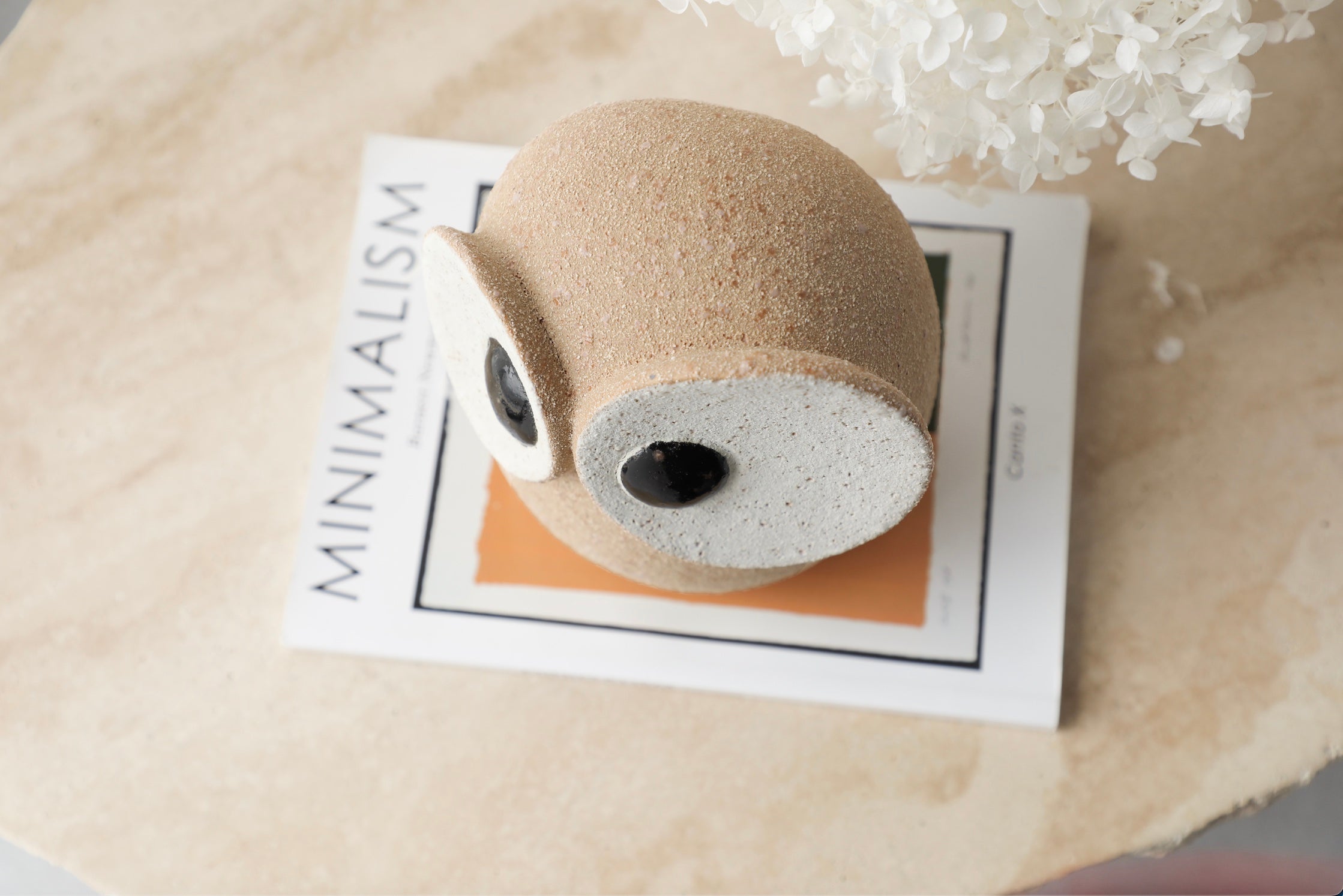Warm, earthy brown circles frame deep, glossy black pupils, creating a gaze that is at once curious, kind, and soulful. Each ornament is individually shaped and meticulously hand-painted, ensuring that its subtle, organic texture and gentle expression are entirely one-of-a-kind. Perfect for bringing a touch of whimsical, natural charm to a bookshelf, desk, or curated nook.