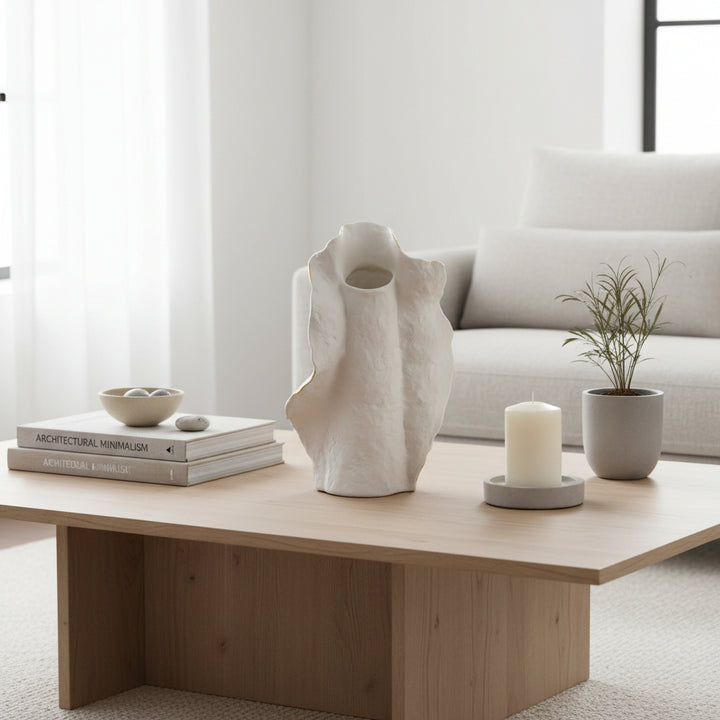 Inspired by the delicate, untamed beauty of an oyster shell and the gentle unfurling of a flower petal, the Kintsugi Bloom Vase is a masterpiece of organic sculpture. This exquisite piece is handcrafted from ceramic, its form a fluid, continuous drape that feels both ancient and entirely modern. Like a soft fabric frozen in a moment of motion, its body is a canvas of subtle texture in a timeless, matte white.