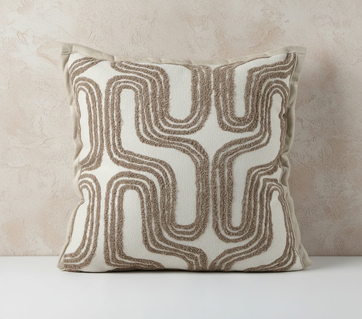 Inspired by the intentional paths of ancient labyrinths and the mesmerising flow of continuous line art, the Labyrinth Pillow is a masterpiece of graphic texture. This elegant piece features a single, uninterrupted line woven in a rich, earthy taupe, creating a complex and compelling pattern across a serene, off-white canvas. The raised, tactile weave of the design invites touch, transforming the pillow into a multi-sensory work of art.