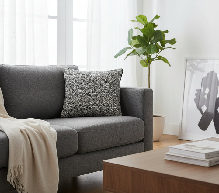 Handcrafted with an exceptionally tactile Slub Jacquard front, the intricate chevron pattern is woven with varying yarn thicknesses, creating a rich, dimensional surface that begs to be touched. The sophisticated palette of charcoal, slate, and soft gray interplays to mimic the nuanced beauty of river-smoothed pebbles, offering a versatile yet impactful visual texture.