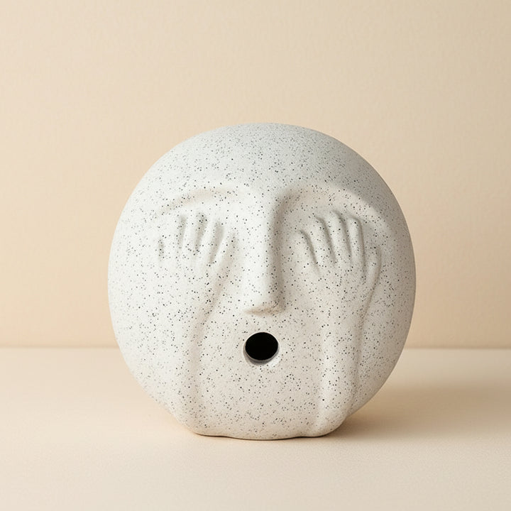 The surface is a contemporary speckled matte white, reminiscent of terrazzo or fine granite, adding tactile interest to its smooth, rounded form. A small, intentional opening at the mouth adds a layer of intrigue, allowing it to double as a unique holder for a single stick of incense, further enhancing its meditative quality. Perfect for a meditation space, a curated bookshelf, or a minimalist desk, the Sanctuary Sphere brings an aura of serene artistry and quiet introspection to your home.