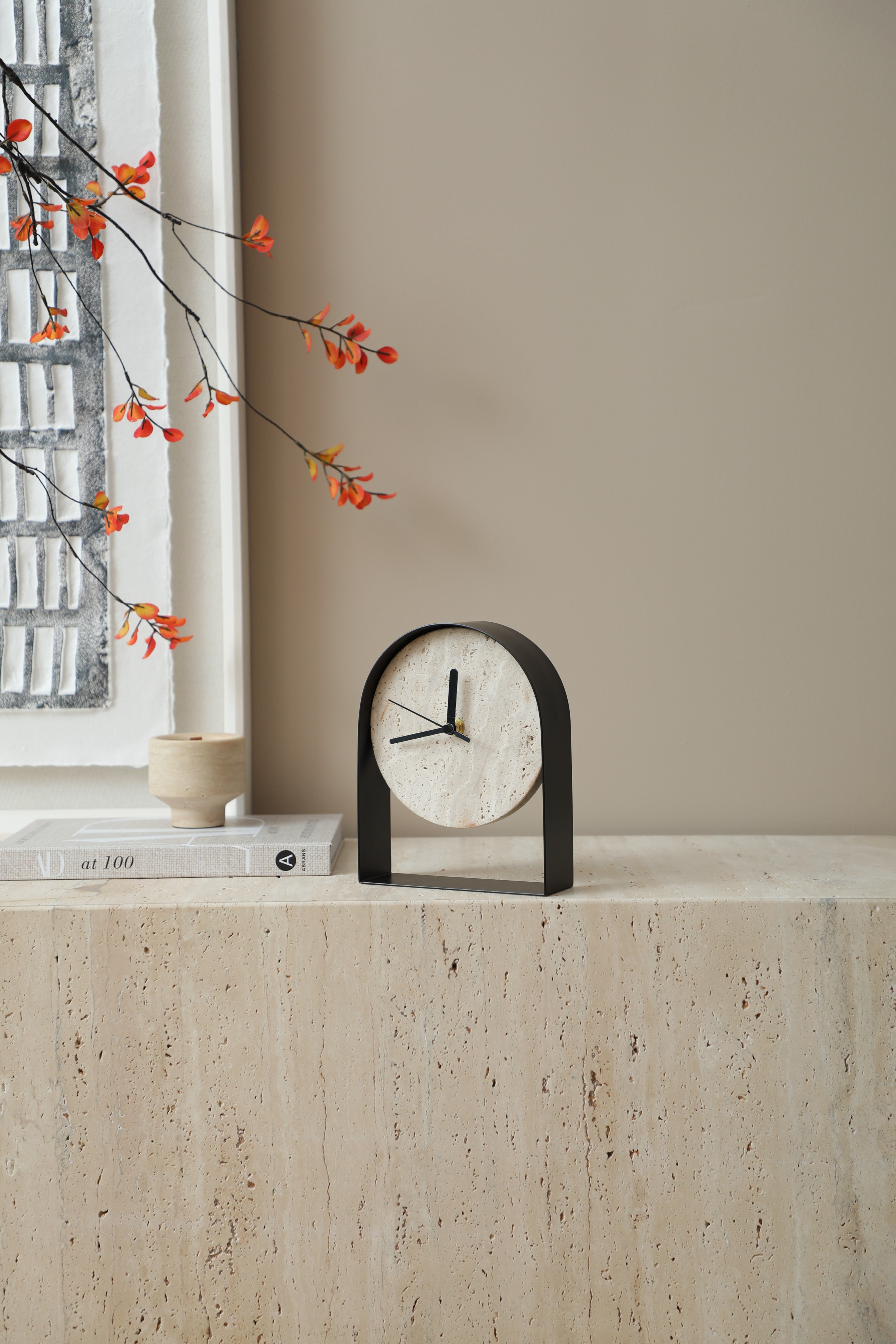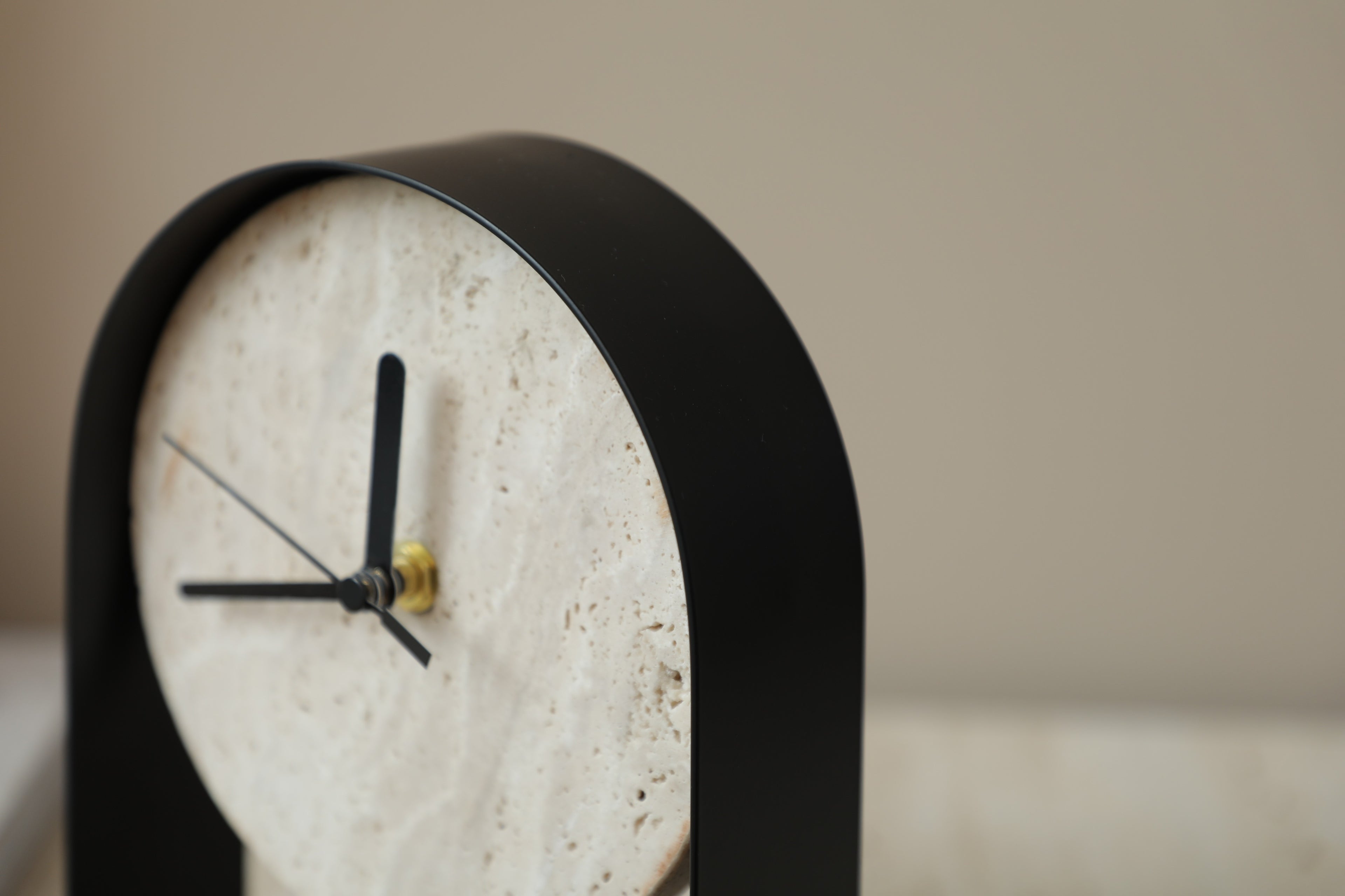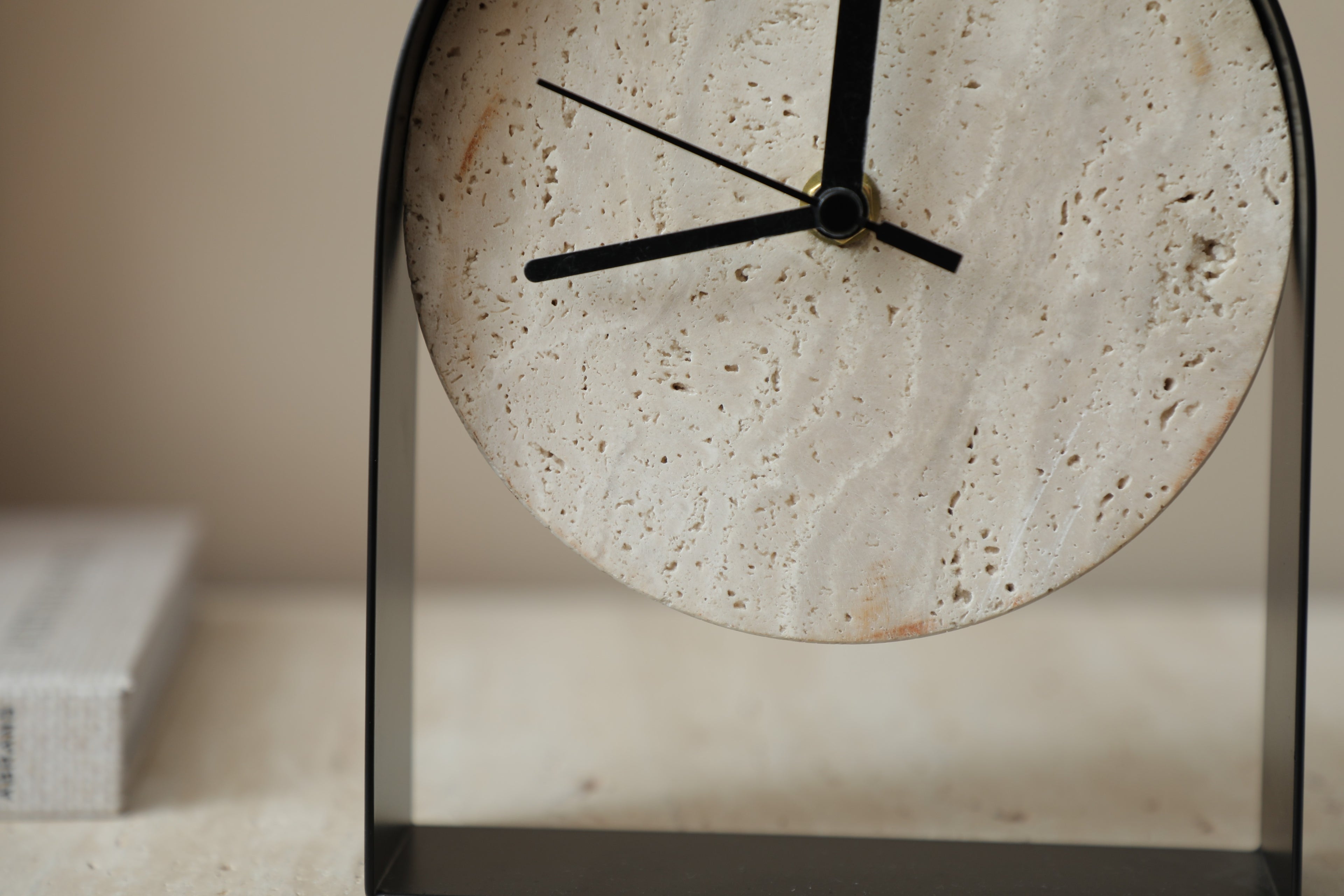 The entire body is carved from solid Travertine stone, a material revered since Roman times for its exquisite, porous texture and warm, creamy hue. Every single clock is unique; the natural veining and pitting—characteristic of true Travertine—means yours will have its own distinct, unrepeatable pattern.